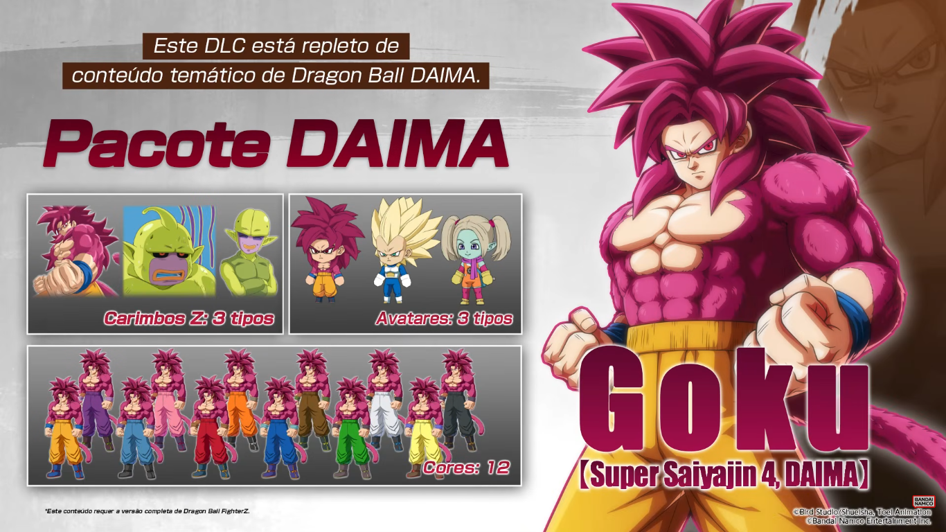 Goku (Super Saiyajin 4, DAIMA) estará disponível através do “Pacote DAIMA”, que inclui o novo personagem, 12 cores padrão, três selos Z e três avatares para o lobby.